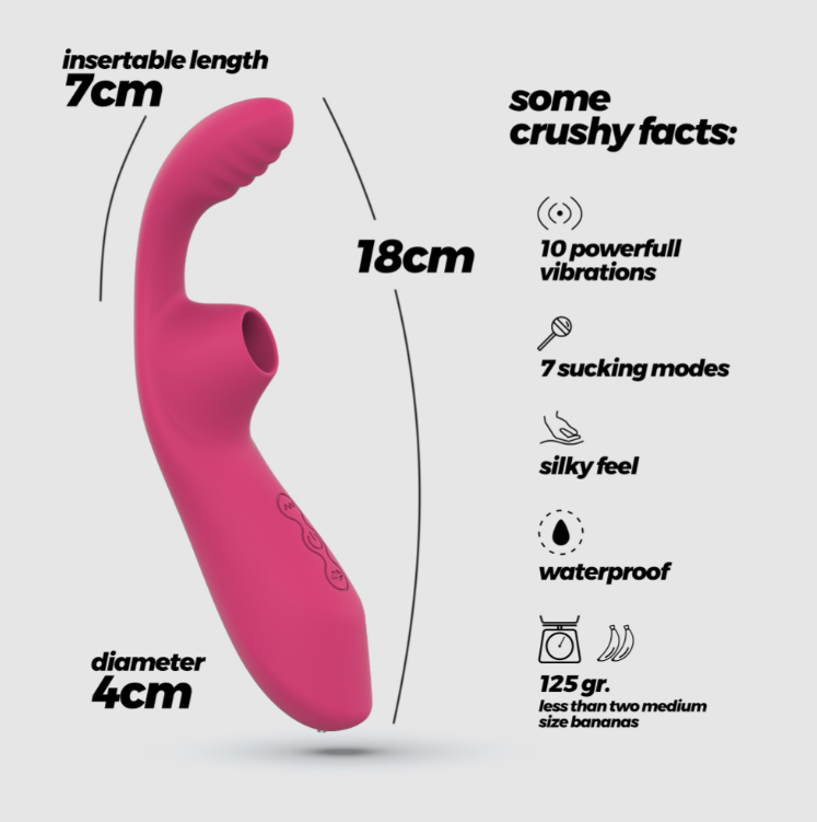 Cyrano es el poeta que tus puntos erógenos estaban esperando. Cada pulsación de los botones te ofrece modos de succión y vibración que te harán alcanzar orgasmos de poema. Atrévete a aventurarte entre los 10 modos vibratorios y los 7 modos de succión y combínalos para alcanzar nuevos niveles de placer. Su increíble forma está diseñada para proporcionar placer tanto en el clítoris como en el punto G al mismo tiempo. ¿Por qué ducharse solo? Cyrano es resistente al agua, utilízalo bajo el agua para aumentar la potencia de succión. Y al ser recargable mediante cable USB, asegura modos potentes y constantes de principio a fin. Por favor, carga completamente Cyrano antes de usarlo. La luz parpadea al conectar el cargador para indicar que la batería se está cargando. Cuando la carga está completa, la luz se queda fija. Carga completa durante 150 minutos. Utiliza tu estimulador durante 70 minutos a velocidad alta y 90 minutos a velocidad baja. La limpieza es muy fácil: lávalo con agua tibia y jabón neutro o utiliza un spray limpiador de juguetes que puedes encontrar en la sección Salud e Higiene. Sécalo a golpecitos y guárdalo lejos de fuentes de luz y calor. Se aconseja el uso de lubricante, siempre a base de agua. Los aceites y otro tipo de lubricantes dañarán la integridad del material.